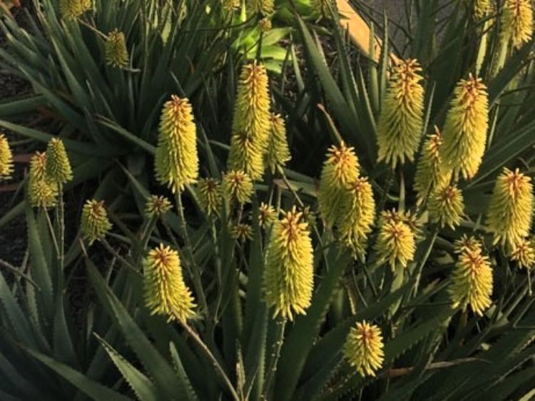 Compact yellow flower clusters open simultaneously in mid winter giving an incredible display of pale yellow. This beautiful medium sized hybrid aloe has grey leaves adorned with a red decorative edge, and is capable of branching and forming a shrub. Suitable for garden beds or in a large pot. Medium rain tolerance. Grows to approximately 80cm tall x 60cm wide.