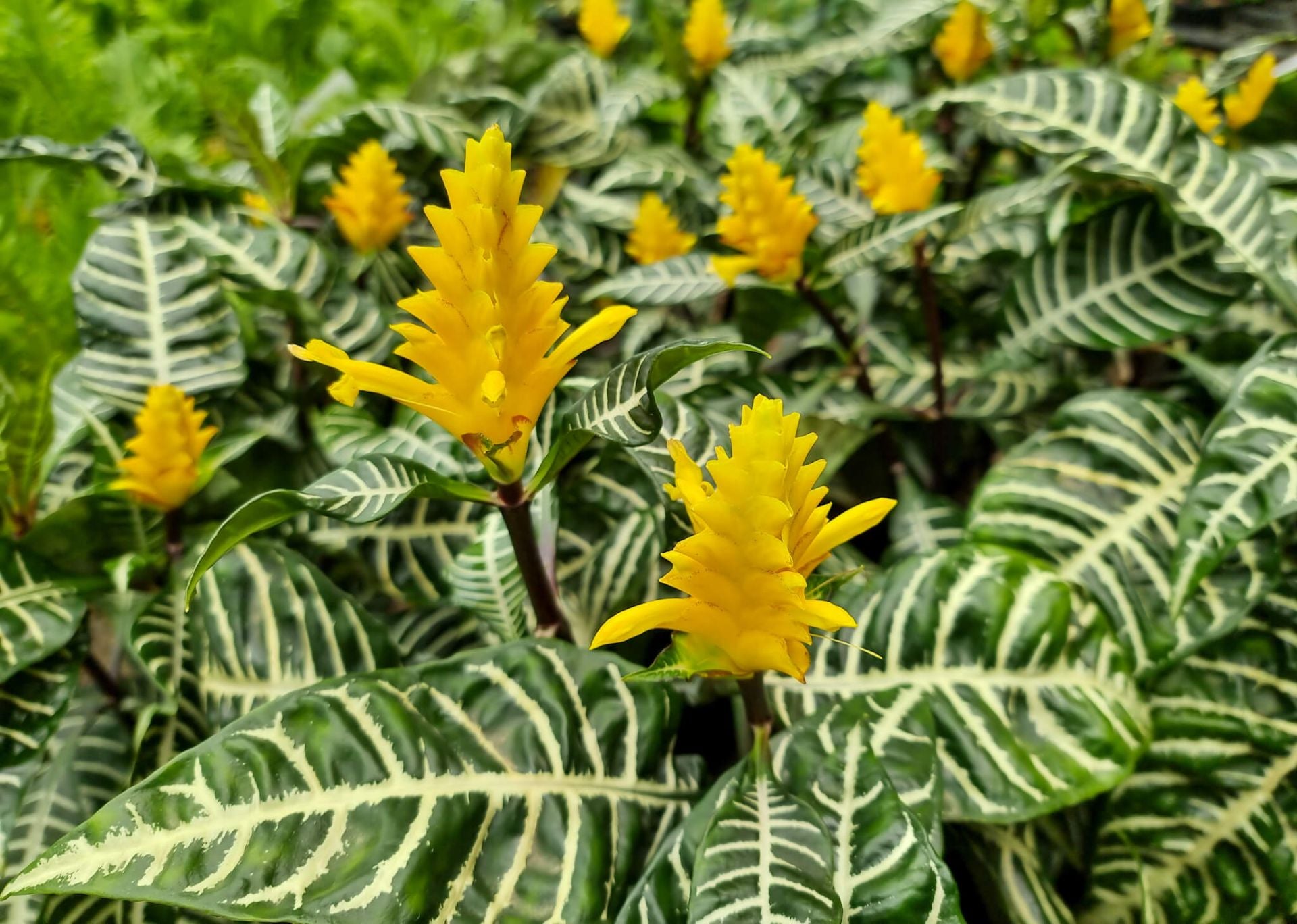 Beautiful evergreen perennial with variegated vein marked dark-green and white foliage and upright yellow flower bracts in summer. Plant in a container to give a tropical feel to a shady courtyard. Perfect for use as an indoor pot plant or in a terrarium. Grows approx. 60cm H x 60cm W.