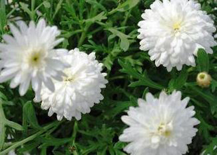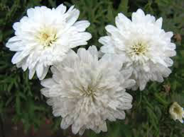 Very popular but short-lived perennial or shrub with clean daisy-like, yellow-centred flowers. Foliage is dark green, deeply cut, and fragrant when brushed against. A bushy classic growing to approx 60cm tall. Many cultivars are available, in single and double-flowering forms—a great choice when you need a fast-growing, flowering border plant. Double White has clean, double-white flowers and a mounding habit.
