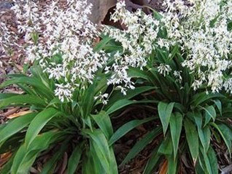 Dwarf New Zealand Rock Lily with lush, arching foliage and white flowers on stems during spring and summer. Grows approx 30cm x 30cm and is a great choice difficult dry, shady positions. Great mass planted, in containers and around pools.