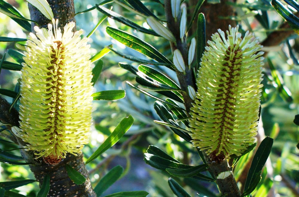 Native shrub with varying habits. Green upper-leaf and silvery undersides ensure interesting foliage complimented by yellow banksia flowers for much of the year.