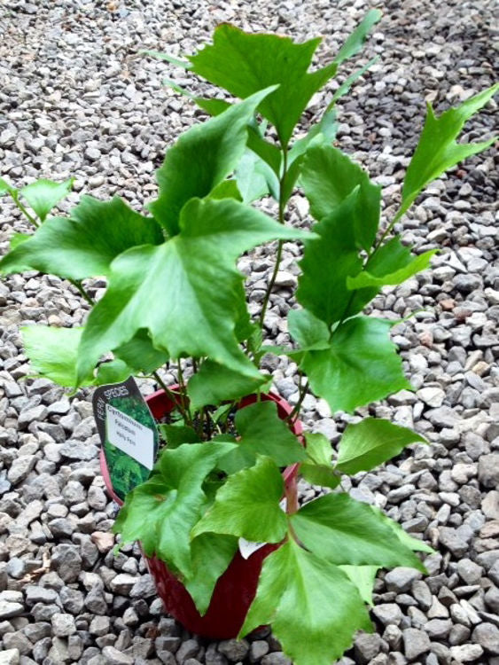 Attractive evergreen vase-shaped clumping fern with thick shiny holly-like fronds. Great to use in rockeries and shady gardens. Cold tolerant. Grows approx. 60cm tall x 100cm wide.
