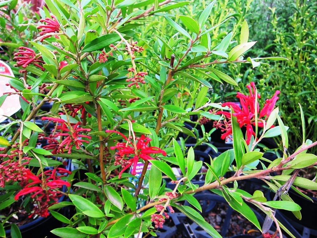Attractive small native spreading shrub with long oval-shaped green foliage and and clusters of spider-like red flowers for most of the year. Great as small hedge. Grows approx 1m-1.5m tall x 2m wide. Bird attracting.