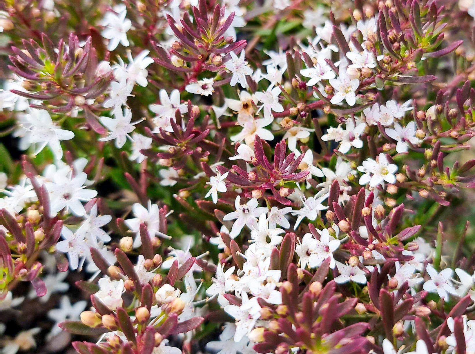 Native, dense low matting groundcover that makes a great weed suppressant. Prostrate shrub with glossy purple leaves. A mass of white small flowers appear along the stems in Spring and throughout summer. These flowers are lightly honey scented and waxy. Fast growing and low maintenance, Myoporum is a great choice for bank stabilisation, is fire retardant and for coastal sites. A fine leaf form may also be available.