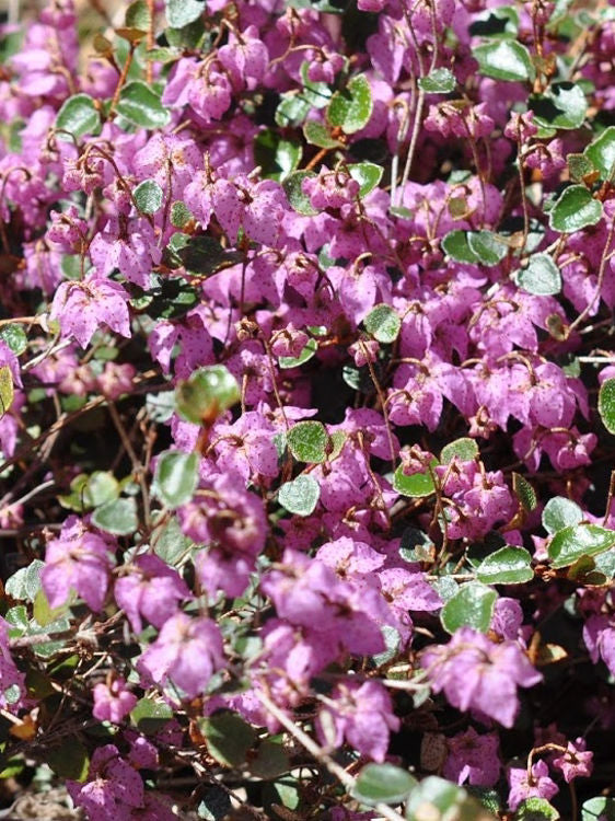 Small evergreen native shrub with a low-growing spreading habit and unique lantern-shaped magenta flowers in Spring and Summer. Great for rockeries or containers.